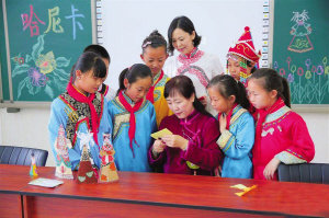 民族小学的学生们在学习制作达斡尔族传统玩具哈尼卡。连振摄
