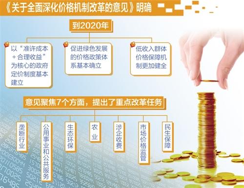 《意见》为我国推进价格改革设置了明确的时间表。到2020年,市场决定价格机制基本完善,以“准许成本+合理收益”为核心的政府定价制度基本建立,促进绿色发展的价格政策体系基本确立,低收入群体价格保障机制更加健全,市场价格监管和反垄断执法体系更加完善,要素自由流动、价格反应灵活、竞争公平有序、企业优胜劣汰的市场价格环境基本形成。