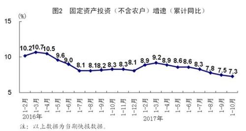 “三去一降一补”取得新进展。去产能、去库存成效突出。钢铁、煤炭去产能年度目标已超额完成,1.4亿吨“地条钢”产能出清。10月末,商品房待售面积同比下降13.3%,降幅比上月末扩大1.1个百分点。去杠杆、降成本稳步推进。9月末,规模以上工业企业资产负债率为55.7%,比上年同期下降0.6个百分点。前三季度,规模以上工业企业每百元主营业务收入中的成本为85.56元,比上年同期减少0.23元。短板领域得到加强。1-10月份,生态?;ず突肪持卫硪怠⒐采枋┕芾硪?、农业投资同比分别增长24.1%、23.4%和17.6%,分别快于全部投资16.8、16.1和10.3个百分点。