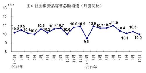 10月份,社会消费品零售总额34241亿元,同比增长10.0%,增速比上月回落0.3个百分点,与上年同月持平。按经营单位所在地分,城镇消费品零售额29537亿元,同比增长9.8%;乡村消费品零售额4704亿元,增长11.3%。按消费类型分,餐饮收入3852亿元,增长10.3%;商品零售30389亿元,增长10.0%。消费升级类商品快速增长,10月份,限额以上单位体育娱乐用品类、化妆品类商品零售额同比分别增长19.6%和16.1%。1-10月份,社会消费品零售总额同比增长10.3%,增速与上年同期持平。