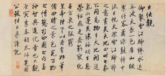 值得注意的是:前后裱换上了新材料,蔡题被移到了卷尾,变成了跋文。其依据有三:一、蔡题上的疲损裂痕与卷首的发展趋向是一致的,同时受损,由于前隔水用绢的材质不及画幅,加上它位于前部,受损的程度会更高,蔡题已经疲软至极(图1)。二、蔡题的右侧有一方圆形朱文骑缝章,另一半在引首上,使用印泥似宋代水蜜印,与单国霖、单国强和凌利中先生探讨,像“沐”字,尚有另一半在前面的引首上,被切割。三、蔡题多处提及徽宗对王希孟和该图的评价,若题在卷尾是大不敬的,加上蔡京年长希孟51岁,题于卷首,合情合理。蔡京对徽宗的画是题在卷尾,如蔡京在徽宗《雪江归棹图》卷(故宫博物院藏)的后隔水题写的跋文,恭敬地写下了他的观感(图2)。