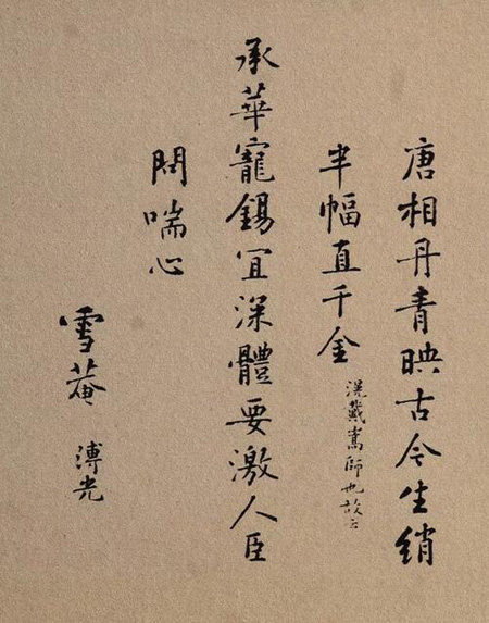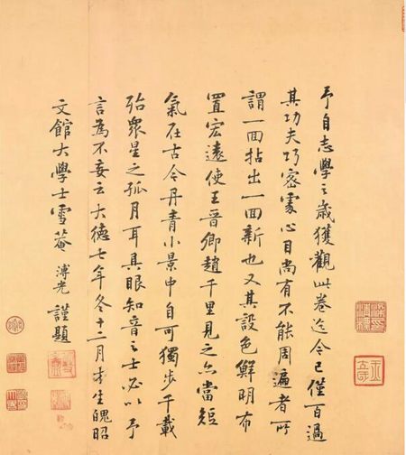 直到明末清初,该图为收藏家梁清标所有,杨新先生认为,梁清标“自题了外签,又在本幅及前后隔水、接纸上盖有梁氏收藏印多方”,显然梁清标对该图进行了第三次装裱,其题签为:“王希孟千里江山图”。溥跋是书写在两张信札上,最后落款在第二张纸上,其字迹均为一人所书,笔迹有明显的渗化现象,这在裱好的拖尾上是不可能出现的,溥跋原来多半是夹在画卷里面,梁清标重裱时,将它裱在蔡题之后,并裁去溥跋余纸,因此留下了两张纸之间的接缝。