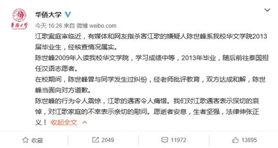 近日有网友发帖称,杀害江歌的嫌疑人陈世峰是华侨大学华文学院学生。昨日下午,华侨大学官方微博发文称,经核查情况属实,杀害江歌的嫌疑人陈世峰是华侨大学华文学院2013届毕业生。