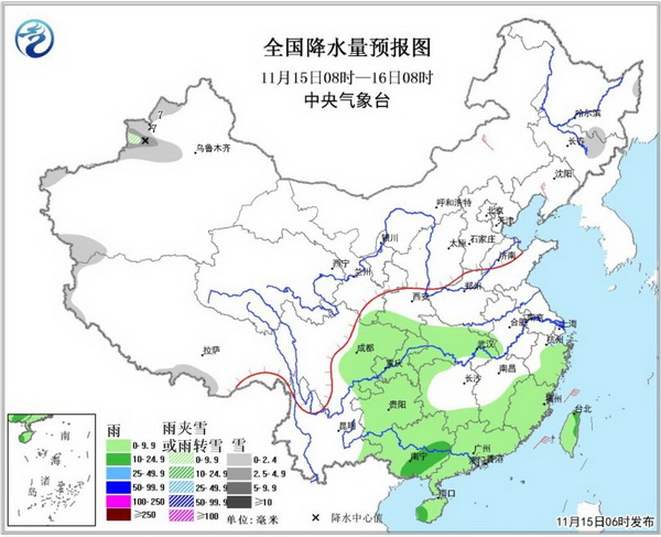 15日08时至16日08时,新疆西北部有小到中雪或雨夹雪,局地大雪;西南地区东部、江汉、江南东部、华南等地的部分地区有小到中雨;内蒙古中东部、辽东半岛等地有4~5级风。