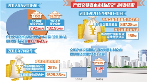 据中国产权协会统计,自《企业国有资产交易监督管理办法》实施至今,产权交易资本市场共为各级国有企业完成增资项目257宗,实现直接融资合计1528.35亿元。2016年,全国产权交易机构以股权融资、债务融资、股权质押融资、政府和社会资本合作(PPP)、金融租赁等多种形式,为各类所有制企业提供融资类服务合计金额4991亿元,与2015年度相比年增幅达239%。