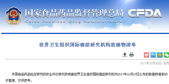 ①国家食药监总局:世界卫生组织国际癌症研究机构致癌物清单