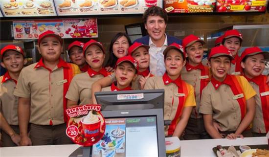 ▲加拿大总理特鲁多到乐蜂快餐店购买炸鸡以及草莓冷饮