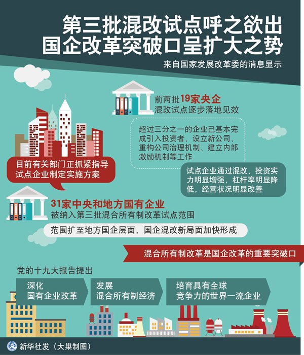 业内人士认为,前两批19家央企混改试点逐步落地见效,第三批试点呼之欲出,而且范围扩至地方国企层面,国企混改新局面加快形成。