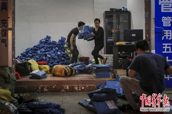 11月5日晚11点,广东省广州市里仁洞村一个快递点里,工作人员杨雪丽在收发快递。里仁洞村是著名的“淘宝村”。中国青年报·中青在线记者 赵迪/摄