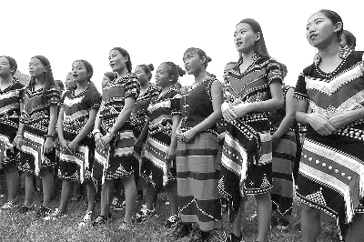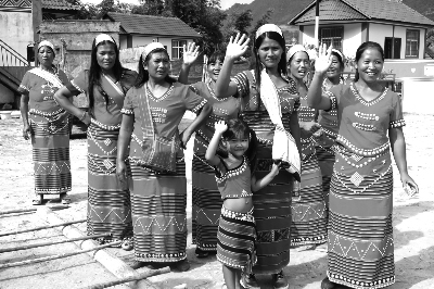 蓝天白云下,骄阳似火,佤族同胞的热情比火更旺。晴朗的天空中回荡着高亢的歌声,铿锵有力的声声木鼓,叩击着我的心扉,让人热血沸腾。突然,一只黑黝黝的手一把拉住了我,猛然回头,发现一位身着桃红色筒裙的佤族妇女,眨巴着大眼睛冲着我笑。她说:“一起跳,一起跳!”乌黑油亮的头发,长长的睫毛,清澈的眼睛,洁白的牙齿……还没等我回过神来,已经被她拉进欢乐的舞群。这个漂亮的佤族青年妇女,名叫娜暖。“你们跳舞是为了庆祝什么节日吗?”我问?!敖裉焓腔队忝堑牡嚼?,平常我们这里天天都这样,没有节日也要唱歌跳舞。”“下雨也跳吗?”我又问?!疤?!”娜暖告诉我,只要是居住在阿佤山的村民,在农活不忙的时候,都会聚在一起唱歌跳舞,这就是我们佤族人的生活。她拉着我的手,一边跳一边开心地笑着。此刻,她五岁的女儿叶鑫也拽着妈妈的裙子,跟在后面学跳舞。见一下子来那么多陌生人,她有些胆怯羞涩,不说话,只是咬着手指,用她那双会说话的眼睛,久久地注视着我们。我从包里拿出糖块递给她,她腼腆一笑有些不好意思,经过妈妈的同意她才接过糖块,脸上露出天真可爱的笑容。
