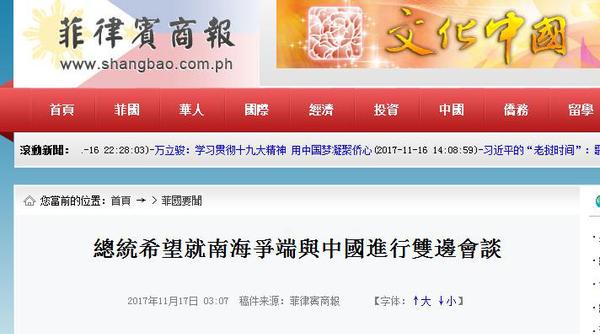 【环球网综合报道 记者 赵衍龙】应菲律宾共和国总统罗德里戈·罗亚·杜特尔特邀请,中华人民共和国国务院总理李克强于2017年11月15日至16日对菲律宾进行了正式访问。16日,中菲发表联合声明。声明强调,针对南海问题,两国建立了中菲南海问题磋商机制?!斗坡杀錾瘫ā?1月17日报道称,当被要求证实总统的声明时,杜特尔特总统的发言人哈里·罗克说,菲律宾总统确实同意通过双边谈判处理该问题。