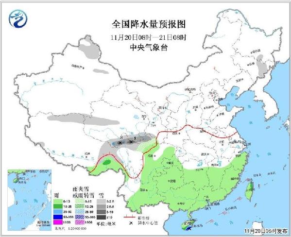 20日08时至21日08时, 海南岛有较强降水。新疆北疆、青海东南部、川西高原北部、西藏东部等地有小到中雪或雨夹雪,青海东南部和川西高原西北部局地有大雪;西南地区东部、江南大部、华南大部、云南东部等地有小到中雨,其中,海南岛东南部有大到暴雨,局地有大暴雨(100~120mm);内蒙古中西部、甘肃西部等地有4~6级风。东海南部海域、台湾海峡、南海北部和中部偏北海域、北部湾将有6~7级、阵风8~9级的东北风。