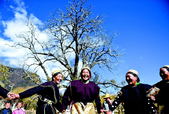 11月19日,林芝市布久乡麦巴村妇女在农田里祭丰收女神。11月19日是藏历十月初一日,西藏林芝工布地区的群众举行丰富多彩的活动,喜迎工布新年。