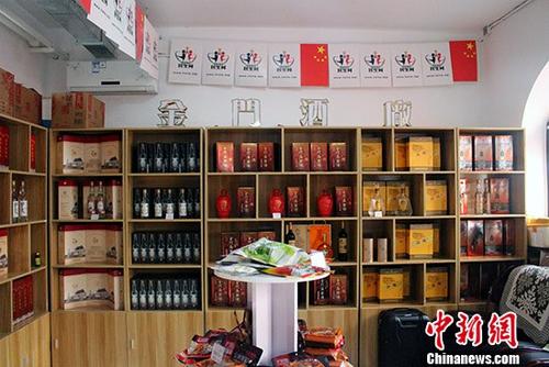 11月19日,海峡两岸民生网台湾商品展销中心在北京正式开业。图为展销中心现场设立的台湾“金门酒厂”专柜。(张晓曦摄)