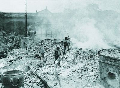 ▼1923年6月26日晚9时,建福宫花园敬胜斋起火,大火很快延烧到南邻的延春阁,高大的延春阁掉落的构件又引燃了周围殿座。由于建福宫花园地处内廷北侧,建筑密度大,附近又没有可以利用的水源,在很短时间内花园的中路和西路就陷入了火海,就连毗邻的中正殿一区也未能幸免。至28日凌晨,意大利使馆派30余名士兵参与扑救,大火才最终被扑灭。据事后统计,大火烧毁了敬胜斋、静怡轩、延春阁、吉云楼、慧耀楼、碧琳馆、妙莲花室、积翠亭、玉壶冰、广生楼、香云亭、中正殿等建筑上百间,贮存其中的大量珍玩、典籍、宗教法器被焚毁,损失不可胜计。图为消防人员正在救火,现场一片狼藉。