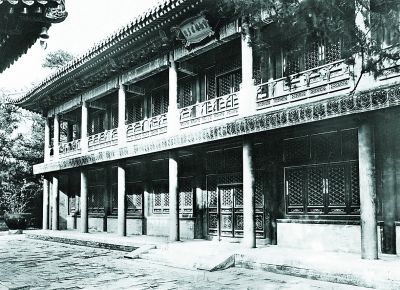 ▲漱芳斋是清帝宴集观戏之所。每年元旦,清帝要在此举行开笔仪式。元旦这天,皇帝着吉服于殿内升座,御案上陈设着金瓯永固杯,杯中注满屠苏酒,皇帝拿起“赐福苍生”笔,书就新年的第一字,是为“开笔”??仕橥歉?、禄、寿、喜一类的吉祥文字,将其赏赐大臣、宗室、外藩,领受人视为无上的荣耀。本片摄于20世纪20年代。