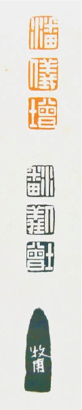 不久前,笔者曾见有人发布了一方带有印章立面、印面、印蜕和刊有穷款“牧甫”二字的三连珠印章图片,即三连珠“潘-仪-增”白文印。但凡从事篆刻研究和创作的专家都知道,这是一方罕见的黄牧甫遗印。这让笔者想起在杭州举行的西泠印社2014年秋季十周年庆典拍卖会“文房清玩·晚清六大家篆刻专场”上,1892年至1899年间,黄牧甫篆刻的三连珠“潘-仪-增”印等10方自用印在西泠印社以241 . 5万元(含佣金)成交。这方三连珠“潘-仪-增”印也被收入《文房清玩·晚清六大家篆刻专场》图录中。从外观上看,这是一方特征明显的高山冻石,其质地较纯,温润凝脂,印章立面中心不规则分布一些乳白色环晕,环多呈粉白棉絮状,大小分布多寡不一,体表微透明偏绿,加上大小环钮相扣,其观赏性更优于其他高山冻石??晌绞延∶?,故此印的艺术价值和收藏价值不言而喻。