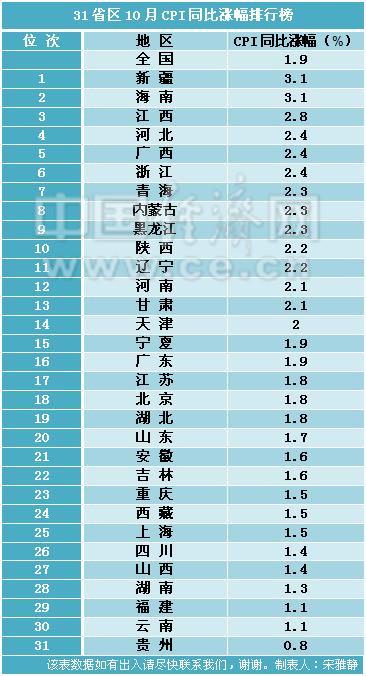 31省区10月CPI涨幅排行榜出炉 14地超全国水平