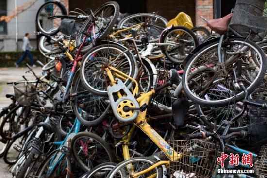 南京大学鼓楼校区内,数百辆被遗弃的自行车堆放在一起。 中新社记者 泱波 摄