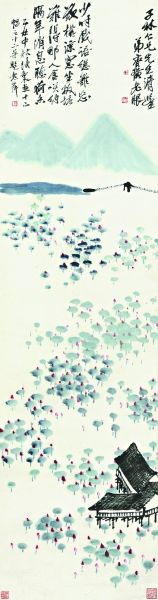图为齐白石《山水十二条屏》中的《板塘荷香》《江上人家》《远岸余霞》《红树白家》