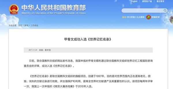 据联合国教科文组织网站,中国申报的甲骨文顺利通过联合国教科文组织世界记忆工程国际咨询委员会的评审,成功入选《世界记忆名录》。