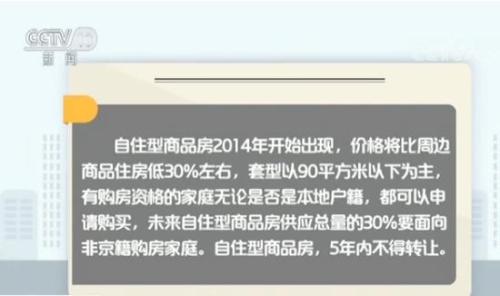 自住型商品房2014年开始出现,价格将比周边商品住房低30%左右,套型以90平方米以下为主,有购房资格的家庭无论是否是本地户籍,都可以申请购买,未来自住型商品房供应总量的30%要面向非京籍购房家庭。自住型商品房,5年内不得转让。满5年转让的,要按照房价差价30%交纳土地收益等价款。从今年9月开始,北京市明确,已经入市但尚未销售的2.3万套自住房和未来的20万套自住房都将转为共有产权住房。