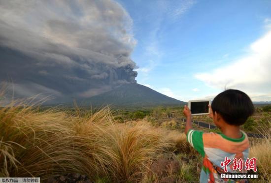当地时间11月26日,印尼巴厘岛卡朗阿森,阿贡火山喷发。图为当地小朋友淡定拍照。