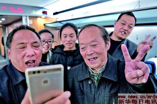 ▲张骞第65代后裔张华忠(左一)、第67代后裔(右二)张永福等在西成高铁55854试验动车的车厢里与家人视频连线。他们是张骞第65—68代传人(11月25日摄)。11月25日,西安铁路局汉中车站邀请张骞后裔体验即将正式开通的西安至成都动车组列车。张骞是汉中市城固人,古代丝绸之路的开拓者。新华社记者陶明摄