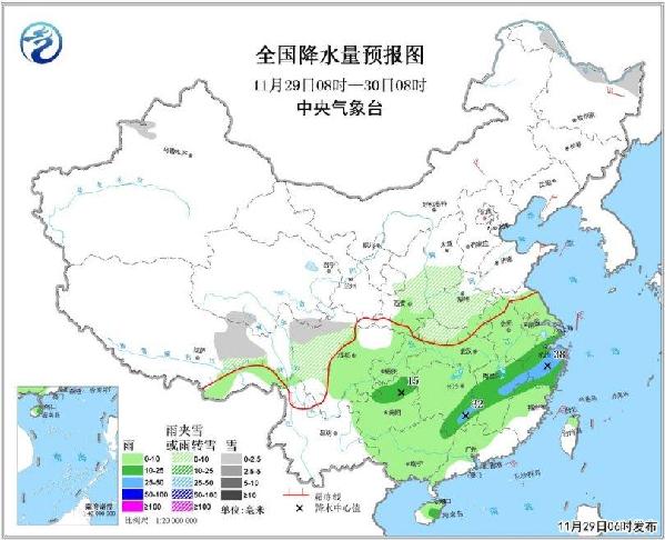 11月29日08时至30日08时,陕西中部、山西南部、河南大部、西藏东部、四川西部等地有小雪或雨夹雪;西南地区东部、江汉、黄淮南部及其以南大部地区有小到中雨,其中,江西北部、浙江东部和中部等地的部分地区有大雨。内蒙古中东部、东北地区南部、黄淮东部、江淮东部、江南东北部等地有4~5级风。