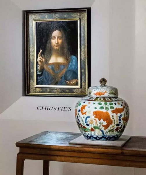 ▲佳士得曾安排达芬奇《救世主》和明嘉靖五彩鱼藻纹盖罐一同展出