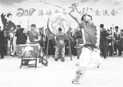 当日,2017海峡两岸武术交流会现场赛事主题活动在北京举行。来自京津冀等省市和台湾地区的数百名武术爱好者齐聚一堂,以武会友,切磋技艺。