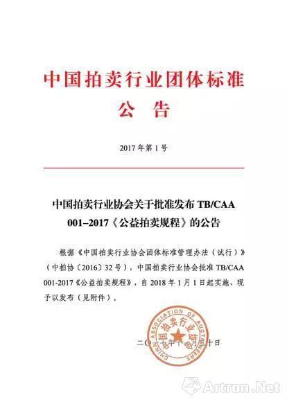 由中国拍卖行业协会批准发布的团体标准《公益拍卖规程》,标准编号T/CAA 001-2017,于11月30日正式发布。该标准是我国拍卖行业的首个团体标准项目,项目由北京拍卖行业协会发起立项并由其承担主要编制工作,参与标准标准的还有行业内外企业、机构、科研院所和各有关学科专家、学者等近30人。