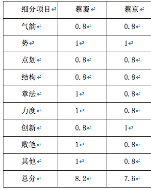 小结,在艺术成就上,蔡襄以8.2分优势领跑蔡京的7.6分