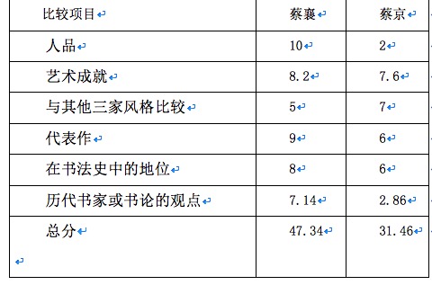 蔡襄以47.34分胜出蔡京的31.46分, 如果不计“人品”一项, 蔡襄也以37.34分高于蔡京的29.46分