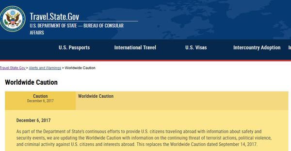 美国国务院于12月6日发布了该则警告称,海外的所有美国人应警惕由恐怖主义、政治动荡、暴力及示威等事件带来的危险,强烈鼓励所有公民保持高度警惕,采取适当措施以提高安全意识。