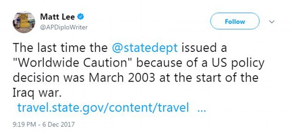 美联社记者Matt Lee称,美国对上一次因国家政策而发布“全球警戒”,是于14年前的2003年宣布发动伊拉克战争之时。