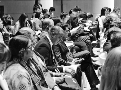在日前举行的中国共产党与世界政党高层对话会上,与会嘉宾在会场阅读《习近平谈治国理政》。光明日报记者 余晓葵摄/光明图片