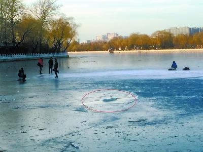 “这么早就上冰啦,多危险啊?!贝耸?,冰面上有四五个人在滑冰,看上去技术都挺娴熟,踩着冰刀旋转、跳跃,滑累了,就搬个马扎,在冰面上坐下来。河岸上,游客们顾不上为精彩的动作叫好,只是替他们暗暗担心。离滑冰者不远处的冰面上,裂纹一道一道的,最宽的裂纹能有两三厘米,之间泛着水花。仔细看,两头的冰面忽开忽合。记者注意到,离滑冰者大约10米的地方,就有个不小的冰窟窿。