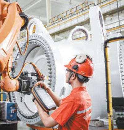 工人在新疆金风科技股份有限公司哈密总装智能生产线上进行数控操作。新华社发