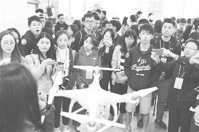 12月5日,在第一届海峡两岸学生棒球联赛总决赛赛后,来自台湾的160余位大学生棒球运动员代表来到深圳大疆创新科技公司参观。图为学生围观无人机。陈 文 摄影报道