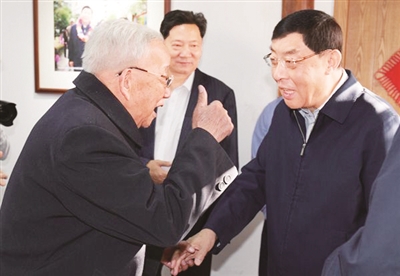 2017年11月,民建中央第一副主席马培华赴浙江省温州、台州两地就民建基层组织建设情况调研。图为马培华(右一)在台州民建会员之家看望老会员。