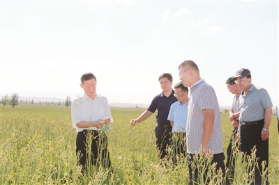2017年8月,民建中央常务副主席郝明金赴宁夏就精准扶贫工作进行调研。图为郝明金(左一)率队在吴忠市盐池县黄花菜种植基地实地考察。