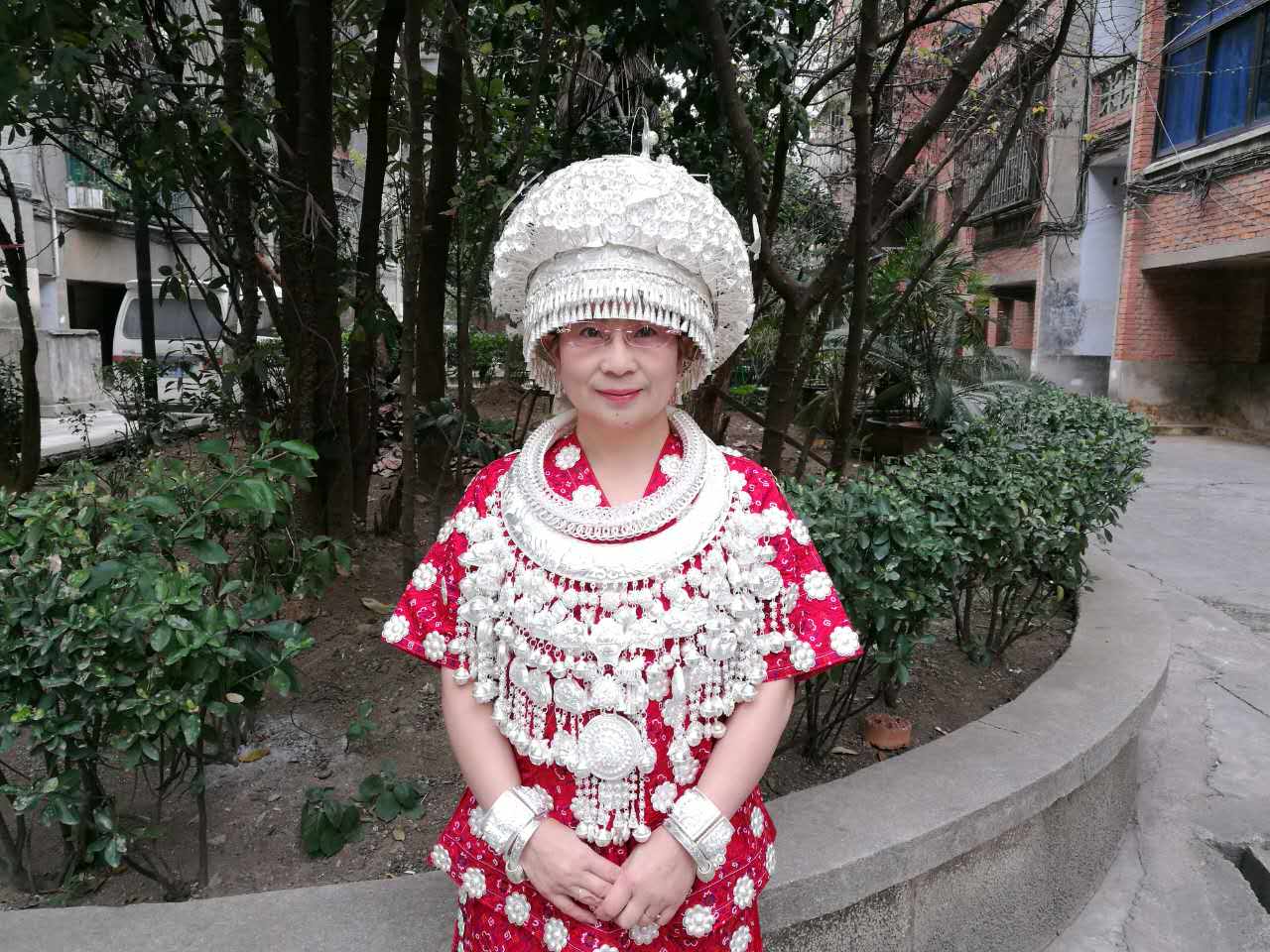 “袖口镶挑花花块,银链吊绣花围腰,套挑花护腕;过膝寸许百褶裙……”这是苗族女子的盛装服饰,潘莉会在盛大节日时穿上这套服饰以示庆贺。
