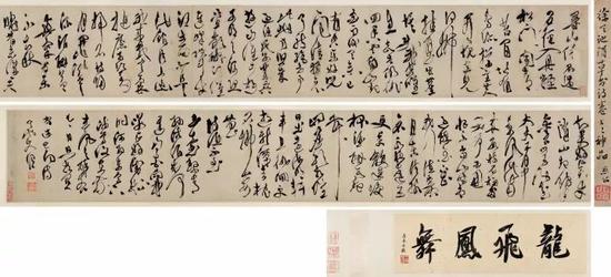 徐渭的书法卷多是行书,草书不多。这卷草书《李太白诗卷》,整卷变化多端,忽而用笔沉着,忽而飞动跳跃,线条飘逸,盘纡缭绕。