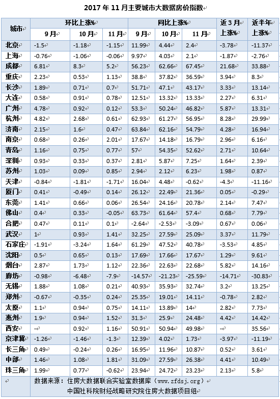 2017年11月大数据房价指数监测发现,一线城市房价全面停涨,其中北京、上海继续下跌,环京板块累计跌幅较大;二线城市中除了成都、南京等少数城市外房价均相对稳定;热点三四线城市如佛山、东莞、合肥、无锡等也趋于停涨。