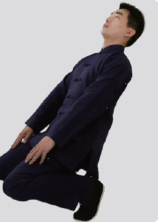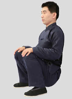 2、 双腿缓缓屈膝下蹲,头部和上身仍旧贴着墙并随着下蹲缓缓下降,同时口吐“嗨”字音,一直蹲到臀部与脚跟、小腿相接触为止,同时双掌扶在膝盖上。