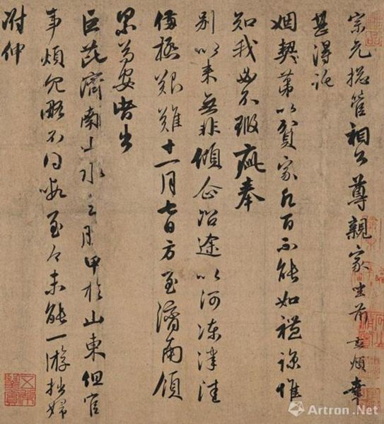 赵孟頫另有一通在济南任上写给其亲家的书信《行书致季宗源二札》现藏于北京故宫博物院。故宫藏赵孟頫《行书致宗源札》的书写日期已有专家考明为至元三十一年二月廿二日,晚于《致宗元总管札》约一年,二札不仅称呼相同,内容亦相连续。由此可知,嘉德札与故宫札受信者是同一人后,再把二札连贯起来读,一个在济南任上的赵孟頫就活脱脱出现在我们面前了。书札虽小,信悉含量却是如此的丰富,赵孟頫《致宗元总管札》重要的史料价值是不言而喻的。当然,它的艺术价值也同样不能忽视。