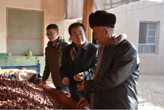 民盟新疆区委会专职副主委尤江斌为亲戚白克尔解决了4亩地800公斤红枣销路问题。民盟新疆区委会宣传部长曹笑艳与亲戚一起到乡巴扎摆摊销售自产红枣、干果,共同体验生活,加深情感。