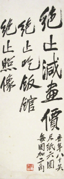 买画的人都希望把画价压低,还有一些熟人或半熟人企图通过请齐白石吃饭来得到画。更有甚者有人用与齐白石合影在外卖假画骗钱。对于这些人当面不好拒绝,为此他只好通过书面告示表达自己的意图?!熬辜趸郏钩苑构?,绝止照相。 ”不但如此,他还以自己的年龄为提价的理由:“吾年八十矣,尺纸六元,每元加二角。 ”