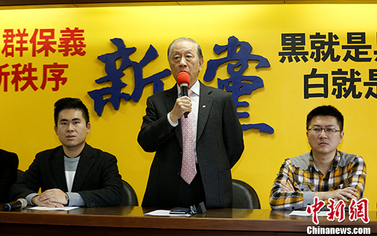 12月26日,新党在台北举行记者会。新党主席郁慕明(中)宣布,将成立“新党服务委员会”,与中共中央台办的相关部门对接,及时服务两岸同胞。新党发言人王炳忠(左)、宣传部副主任林明正(右)等人出席。中新社记者杨程晨摄